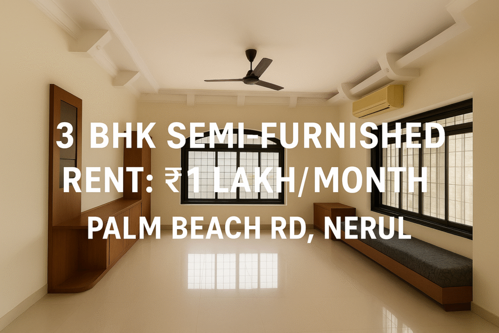 Discover a Home Where Every Day Begins with a View Imagine waking up to the sound of quiet sea breezes, walking out onto your private balcony, and witnessing the horizon unfold before you. This 3 BHK semi-furnished luxury residence for rent on Palm Beach Road, Nerul, is more than just a home — it’s an upgrade in lifestyle. Spread across 1,886 sq.ft built-up and 1,250 sq.ft carpet area, this high-rise apartment has been thoughtfully designed to maximize comfort, openness, and natural light. The jewel of this residence is its wide, curved balcony, offering breathtaking views of the ocean, the greenery below, and the dynamic Navi Mumbai skyline. Whether it’s an early morning chai ritual, an evening sunset meditation, or a quiet moment between meetings, this unique outdoor space adds serenity to your everyday life. Interior Excellence The flat offers a fine balance of elegance and practicality, making it ideal for corporate professionals, entrepreneurs, HNI families, and individuals seeking retreat-style living without leaving the city. Lifestyle Amenities & Building Features The residential complex ensures complete comfort with: Strategic Location — Palm Beach Road Advantage Regarded as one of Navi Mumbai’s most prestigious addresses, Palm Beach Road is home to high-profile residential and commercial developments. This property provides excellent connectivity while maintaining tranquility, aligning perfectly with today’s fast-paced lifestyle needs. Nearby you’ll find: Rental Details